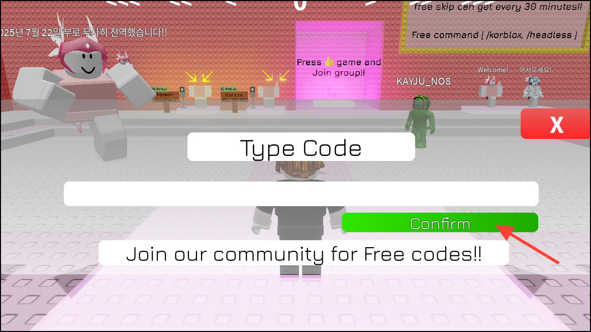 Step 4: Click the green Confirm button to claim your skip. If it doesn’t appear, rejoin a new server and try again.