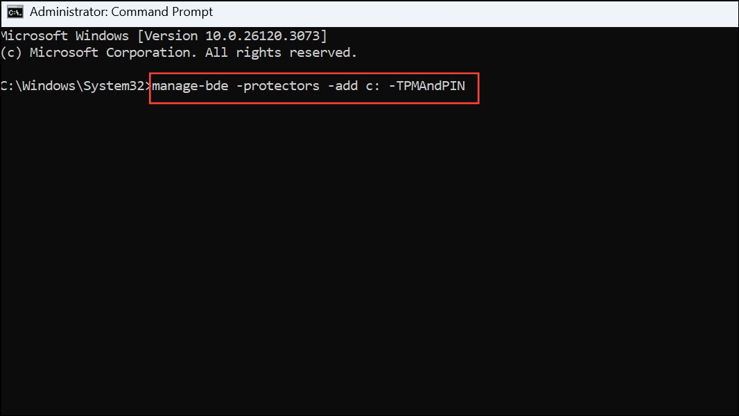 manage-bde -protectors -add c: -TPMAndPINThis command modifies the BitLocker protector for your system drive (usually c:) to require both the TPM and a user-supplied PIN at startup. You’ll be prompted to enter and confirm your new PIN.