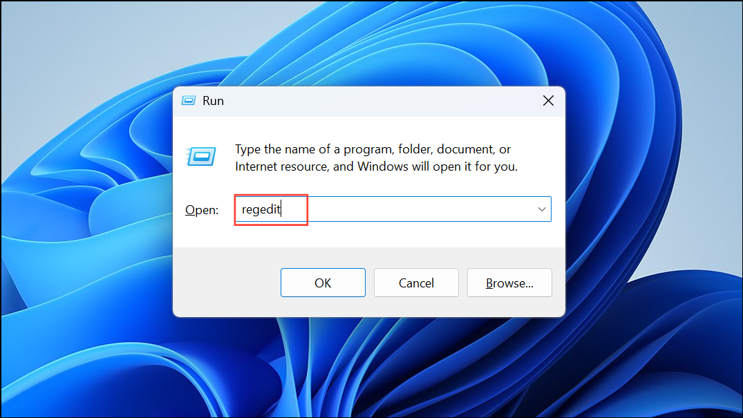 Step 1: Open the Registry Editor by pressing Win+R, typing regedit, and clicking OK.
