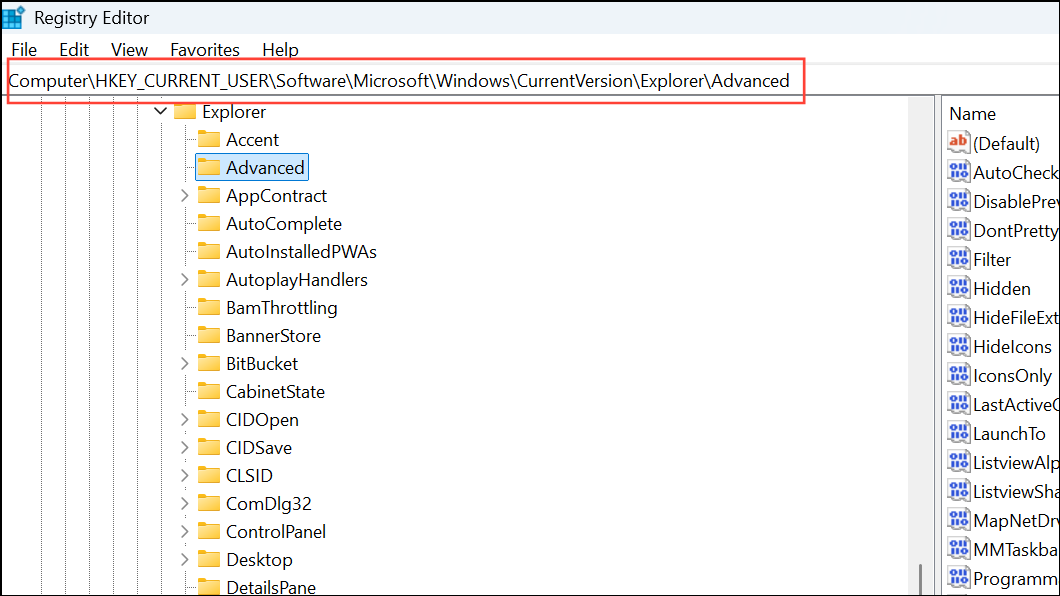 HKEY_CURRENT_USER\Software\Microsoft\Windows\CurrentVersion\Explorer\Advanced