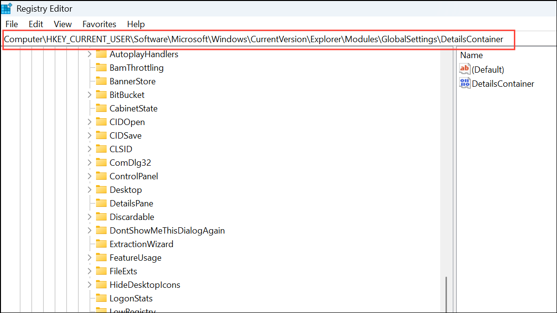 HKEY_CURRENT_USER\Software\Microsoft\Windows\CurrentVersion\Explorer\Modules\GlobalSettings\DetailsContainer