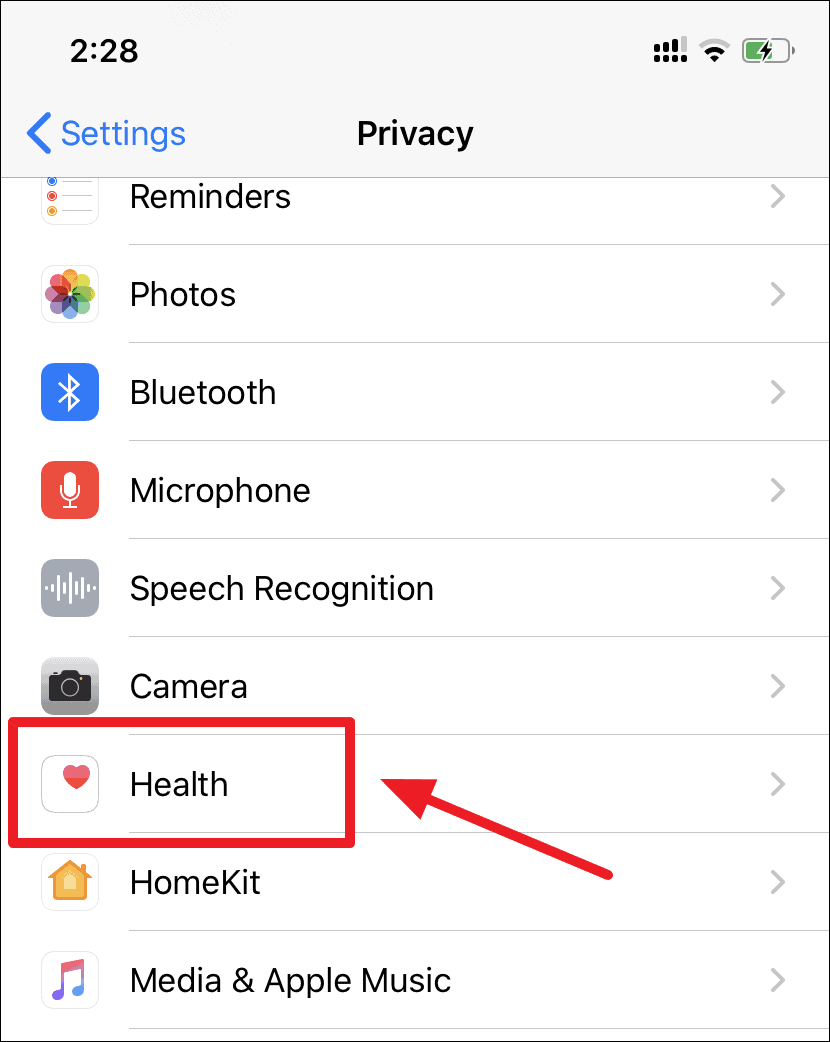 From the iPhone Privacy settings screen, select the ‘Health’ option.