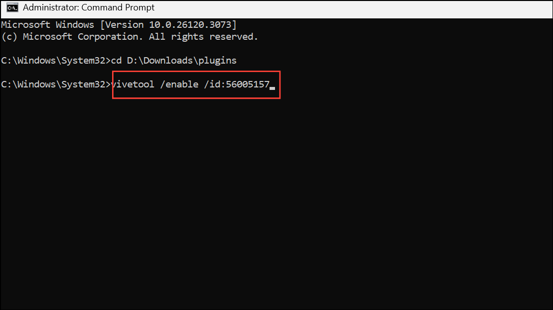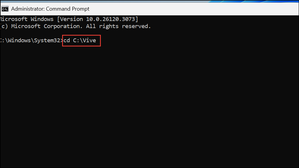 Step 2: Open Command Prompt with administrative privileges. Navigate to the directory where ViVeTool was extracted using the cd command. For example, type cd C:\Vive and press Enter.