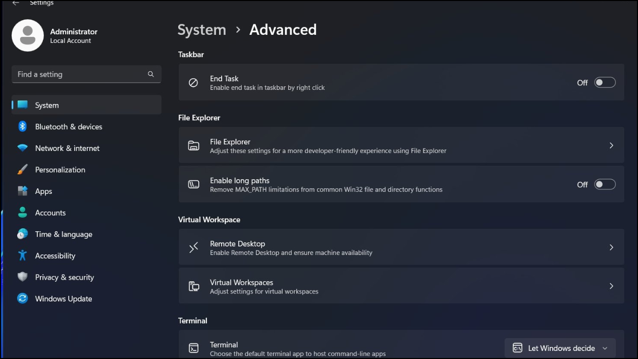 Step 2: Check for Windows updates and install the latest available build. Once updated, look for the Advanced Settings page under Settings > System > Advanced.