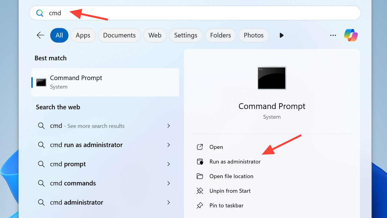 Step 4: Open an elevated Command Prompt. Search for “cmd”, right‑click Command Prompt, and select “Run as administrator”.
