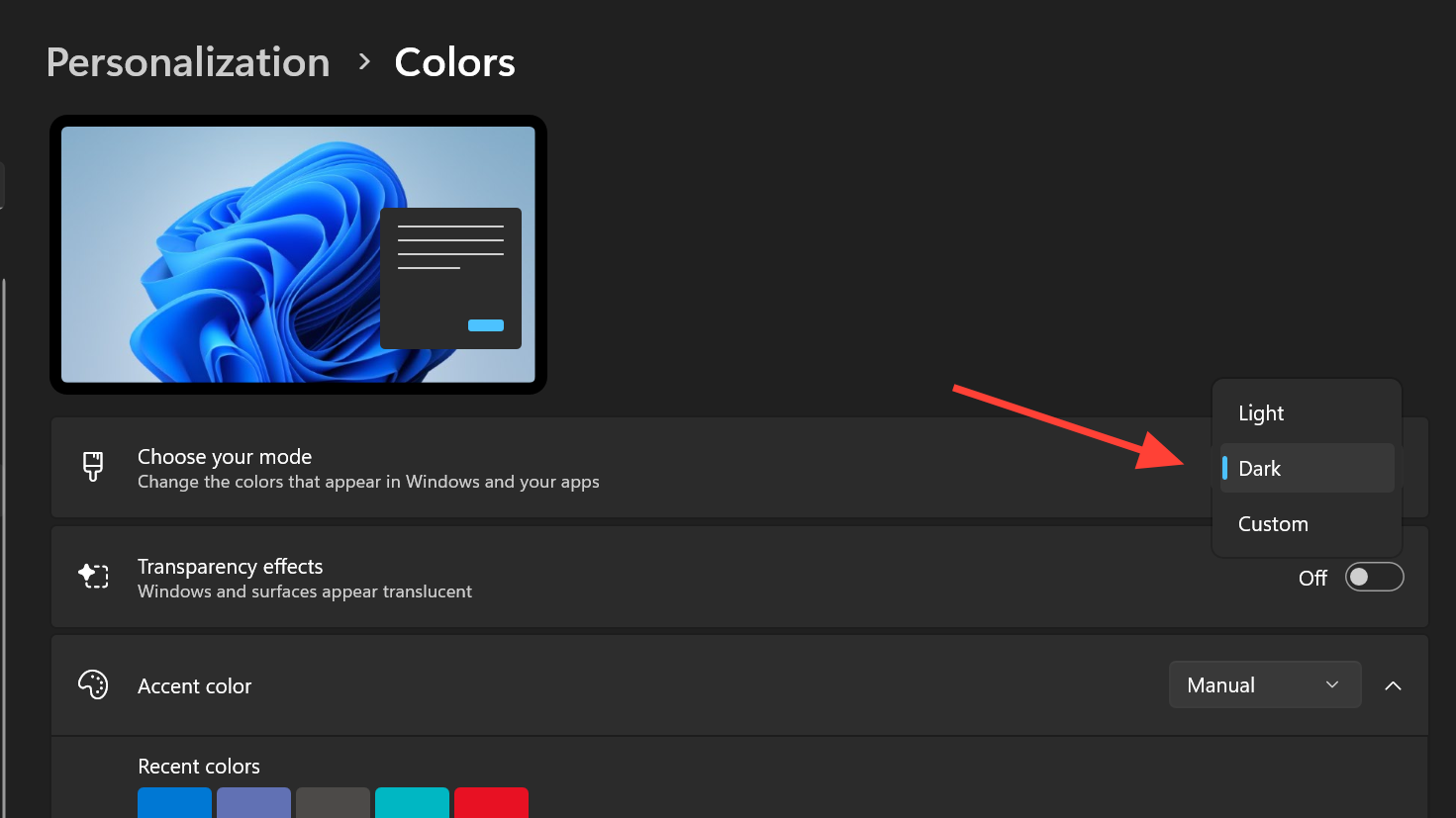 Step 1: Re-apply Dark mode. Open Settings > Personalization > Colors and set “Choose your mode” to “Dark” again.