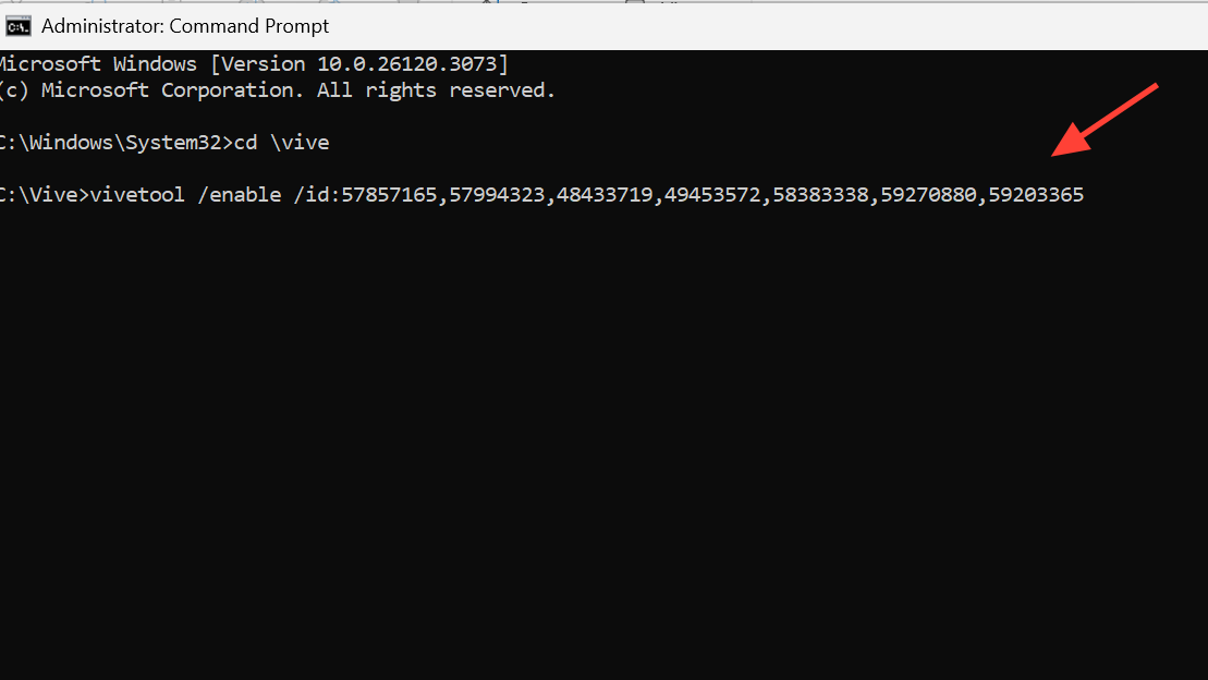 vivetool /enable /id:57857165,57994323,48433719,49453572,58383338,59270880,59203365