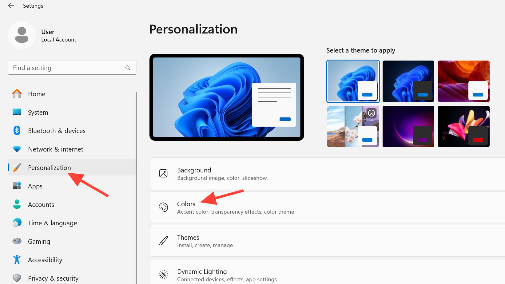 Step 2: Go to Personalization > Colors. This section controls the system and app theme appearance.