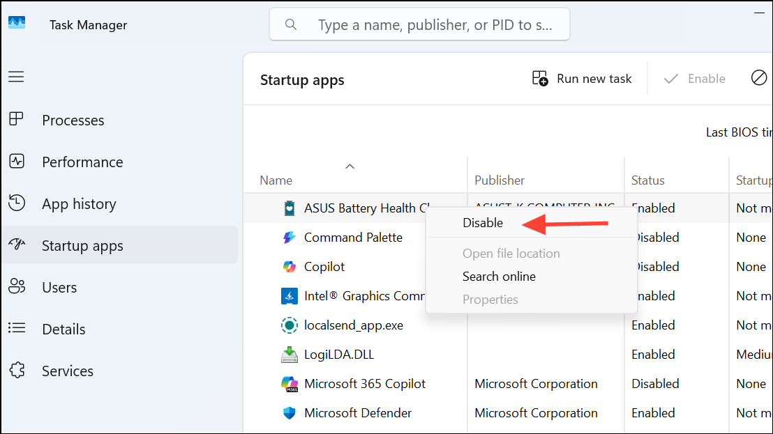 Step 1: In the Task Manager’s Startup tab, right-click an app you want to disable and select Disable. This prevents the app from launching automatically the next time you start your computer. Disabling non-essential apps reduces memory and CPU usage during boot, resulting in a faster and more responsive system.