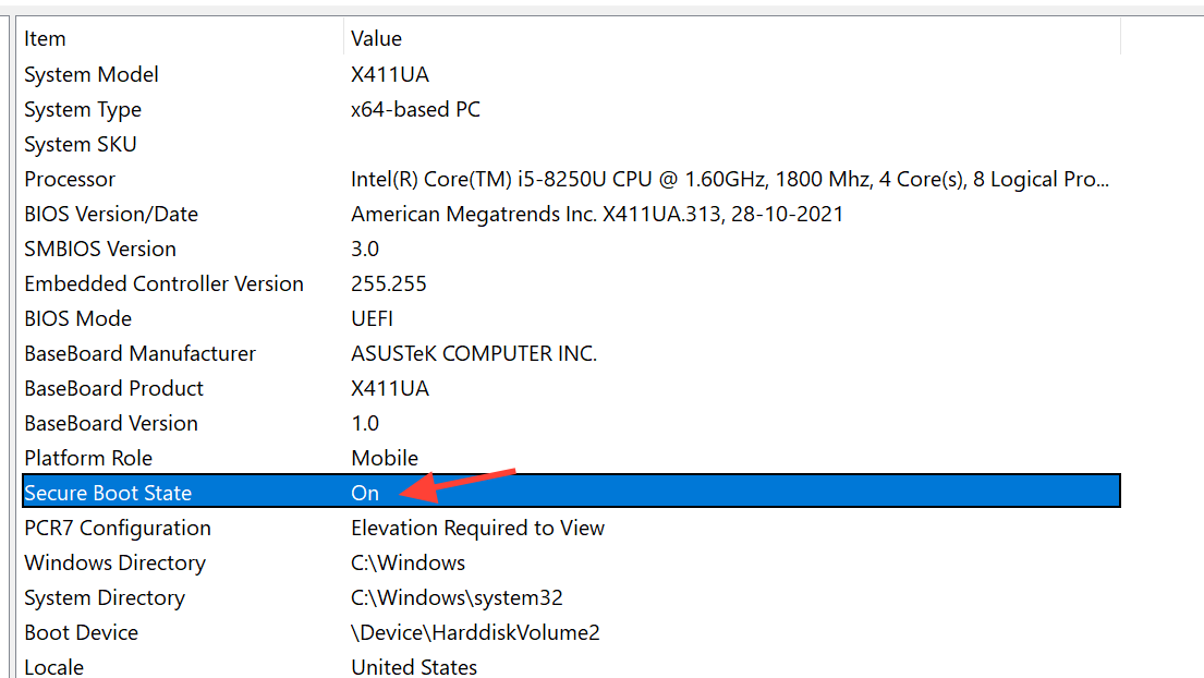 Step 2: Check two fields in System Summary. BIOS Mode should read UEFI, and Secure Boot State should read On. If Secure Boot is Off with BIOS Mode = UEFI, continue below; if BIOS Mode = Legacy/CSM, you’ll need to switch to UEFI and likely convert the disk to GPT; if Secure Boot is Unsupported, consult your motherboard’s specifications or support.