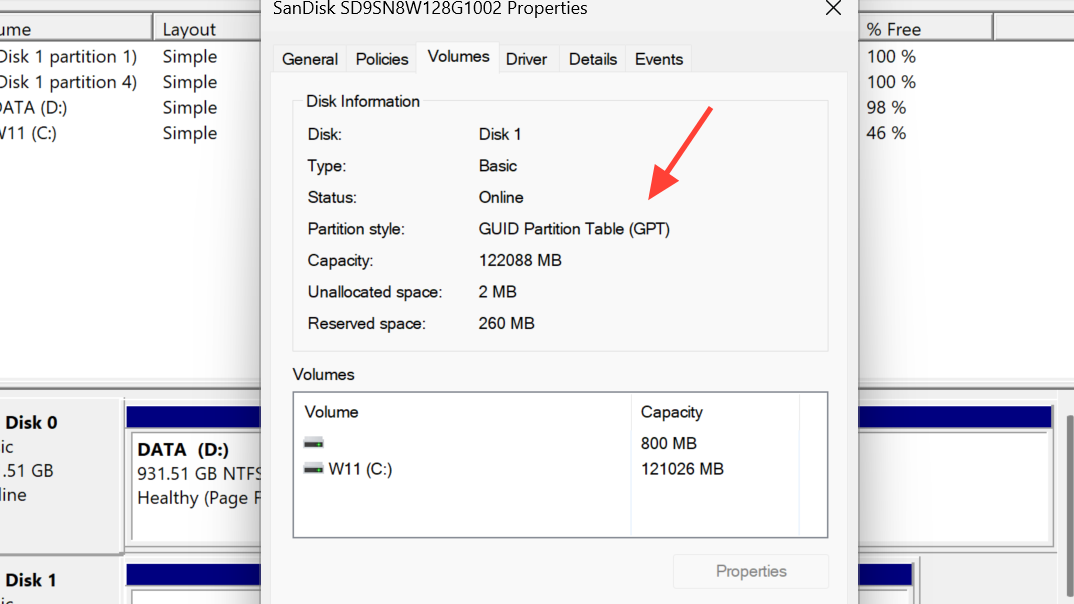 Step 3: On the Volumes tab, check Partition style. If it reads GUID Partition Table (GPT), you’re set; if it reads Master Boot Record (MBR), proceed to the conversion method below.