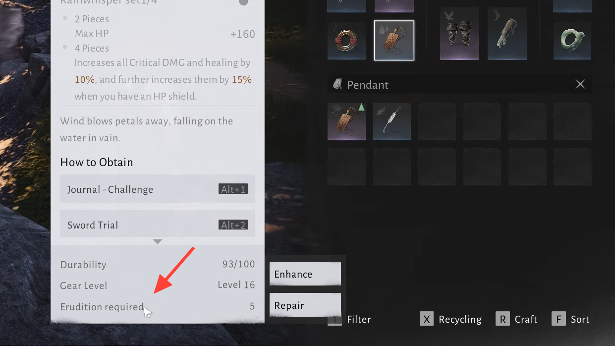 As your Erudition rises, revisit previously unequippable gear in your inventory. Items that were blocked by “Erudition required” will quietly become usable once you meet or exceed their threshold.