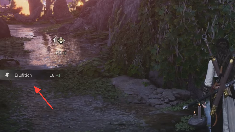 Step 4: Watch the left side of your screen after the clear. A notification shows Erudition increasing, for example “Erudition +1.” Repeat at new Meow Meow locations to keep stacking the stat.