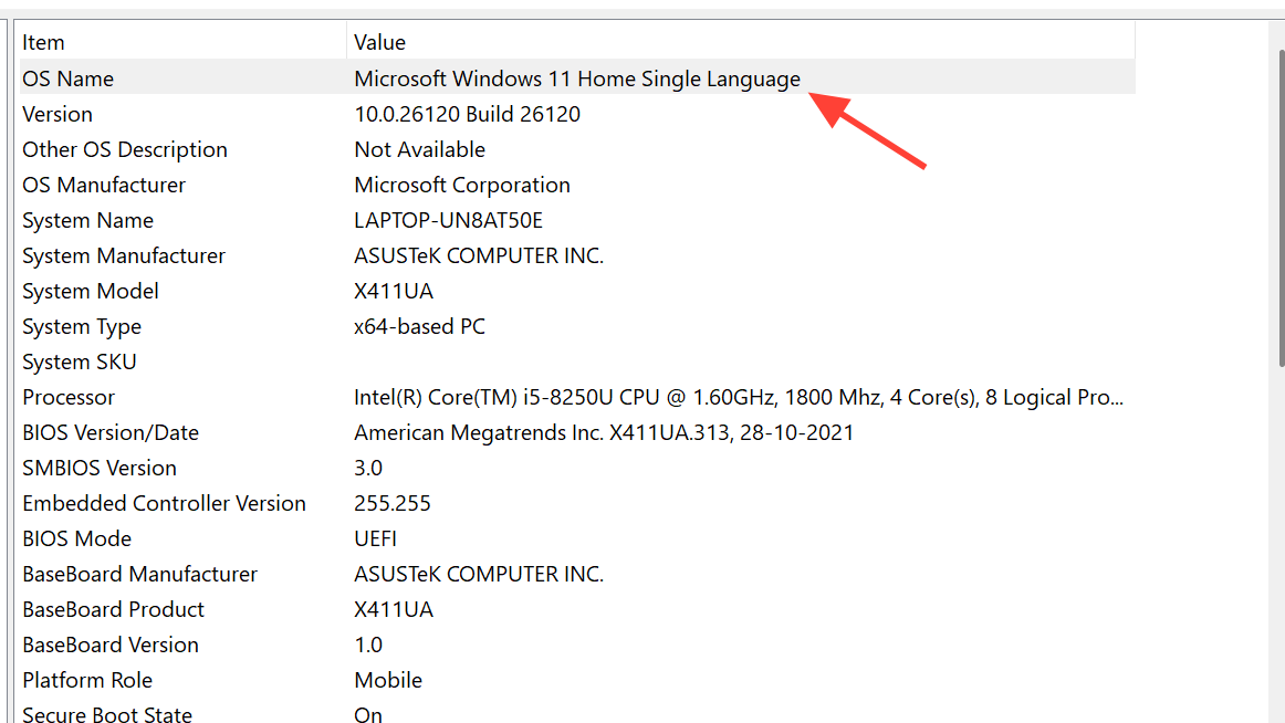 msinfo32, press Enter. Check OS Name and Installed Physical Memory.