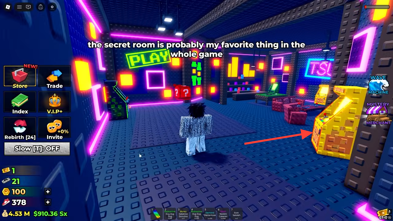 Two arcade machines are available during the Arcade Event. The first is located in the Legendary zone and allows you to fuse 3 Brainrots into one. The second is the golden arcade machine inside the secret room between the Epic and Legendary zones, where you redeem Arcade Tickets for rewards.