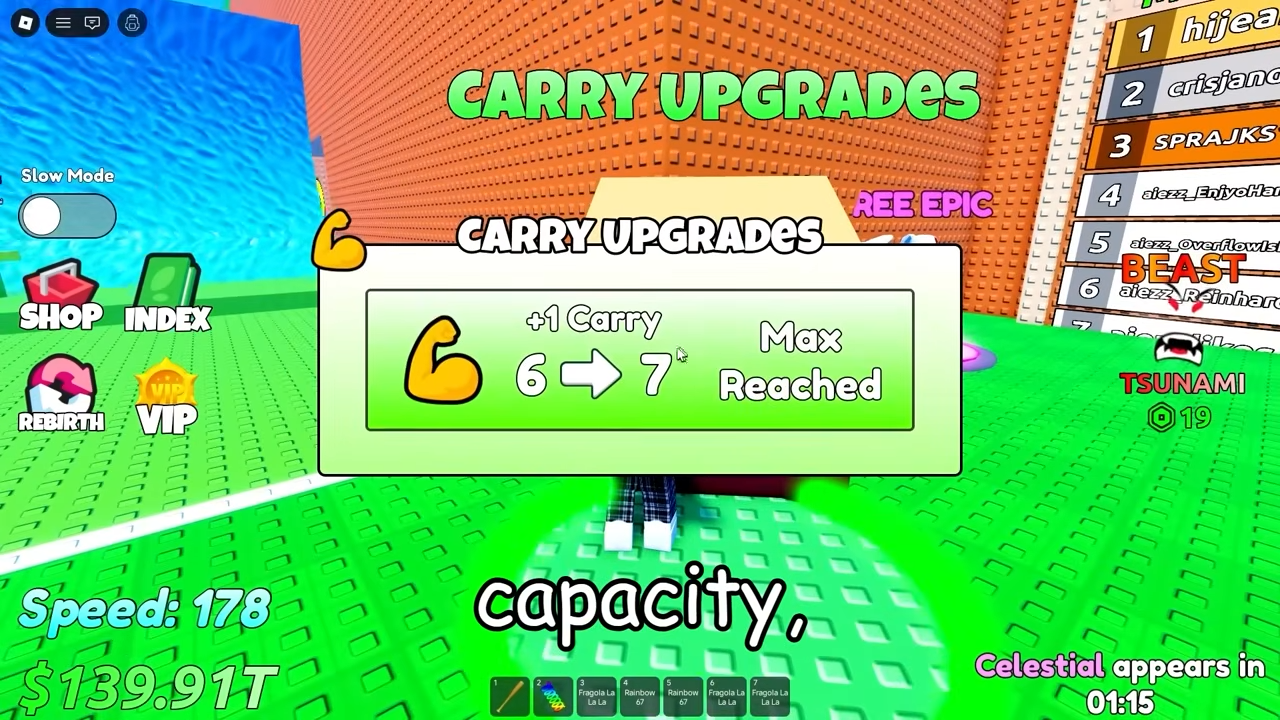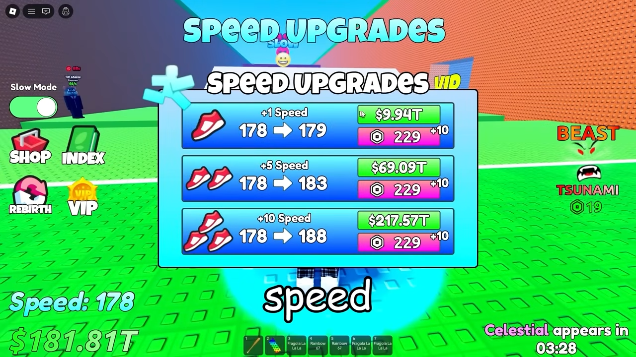 Rebirth sits on top of everything: money, base layout, slots, and placed brainrots. In Escape Tsunami for Brainrots, rebirth is triggered through the dedicated button on the left side of the screen once you meet a speed threshold, not a money threshold.