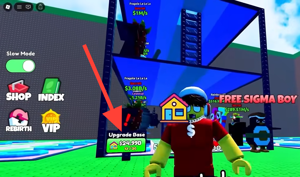 Your base is where brainrots sit and generate money-per-second. Each slot holds one brainrot, and each floor adds a new set of slots. More slots let you park more earners, but every upgrade competes with three other sinks: brainrot upgrades, speed, and rebirth requirements.