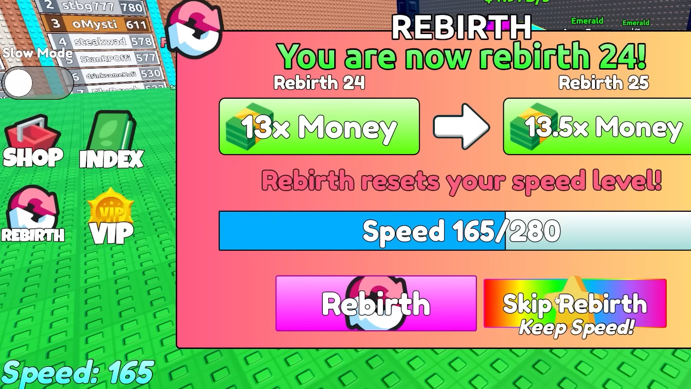 Step 4: Once you are at or above the needed Speed, press the Rebirth button again to confirm the reset and apply the higher Money Multiplier.