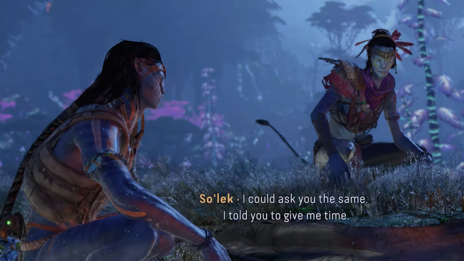 The quest opens at base camp, where Ka’nat explains that Etuwa has pulled away from the others. She is scouting a Sky People camp downriver, consumed by grief and a need for revenge after losing her Ikran, Taloo. The objective is simple on paper: track her down before that anger gets her killed.