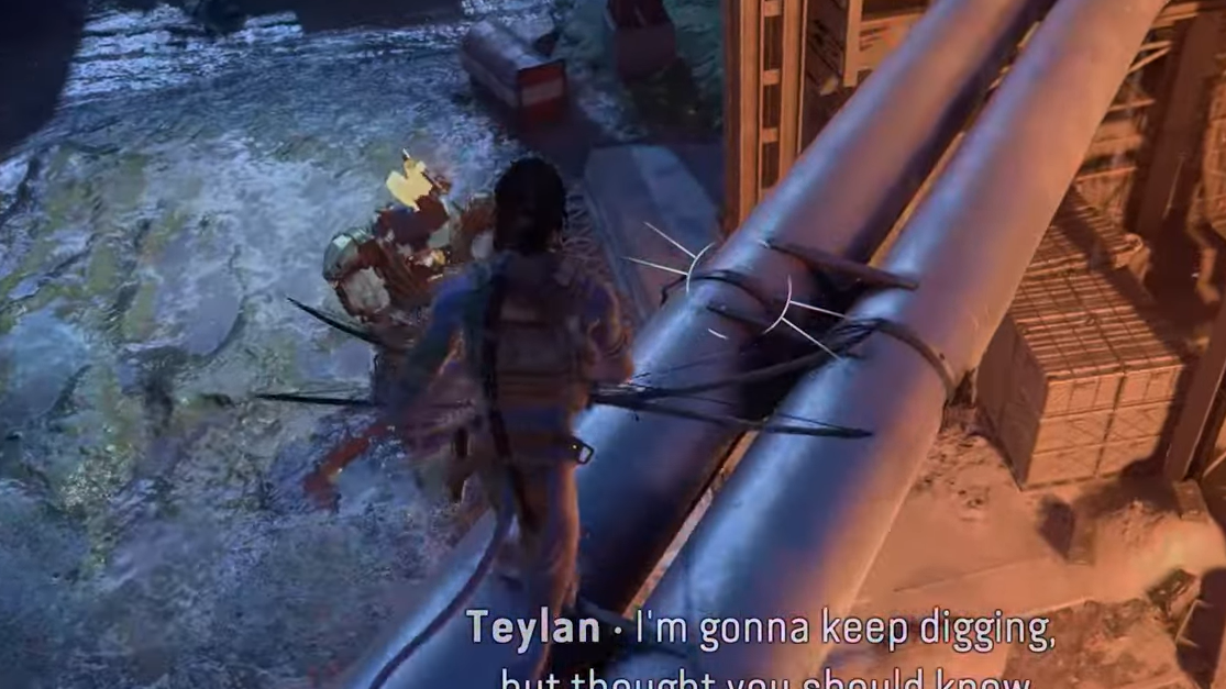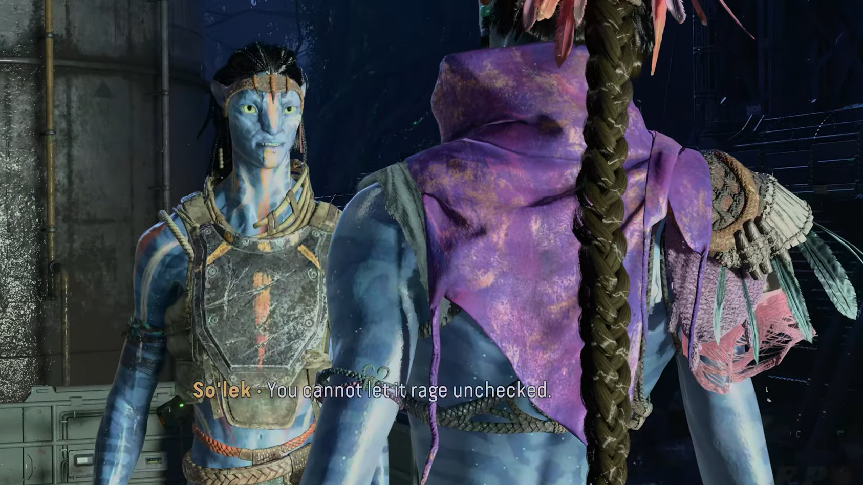 In the cutscene, So’lek finally confronts Etuwa. She is watching the depot from a vantage point, still raw from Taloo’s death. Etuwa believes a Mangkwan responsible for her pain may be hiding somewhere inside Support Depot Charlie. Driven by that single goal, she pushes So’lek to help her tear the camp apart until they find him.