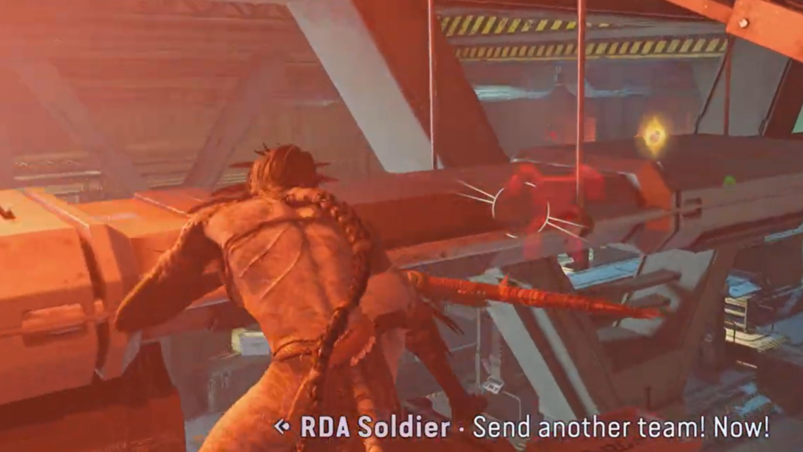 Step 4: Follow the vent until it opens near a set of industrial pipes. From here, you can see Hellhounds patrolling with more RDA soldiers below.