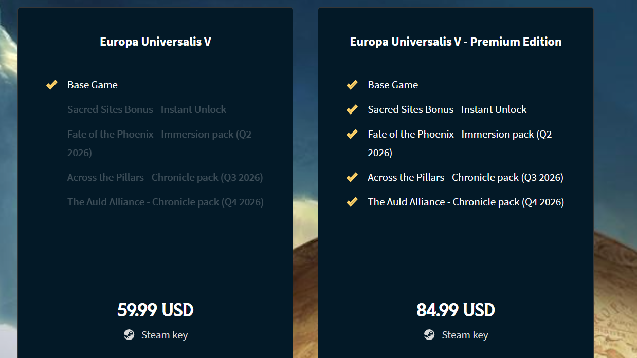 Europa Universalis V is available on Windows PC. Premium Edition buyers get Sacred Sites immediately; the three content packs are slated for Q2, Q3, and Q4 of 2026. That means you can start playing now with the cosmetic map additions, then return for the regional story content on the published schedule.