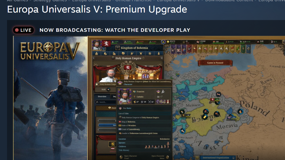 You can purchase Europa Universalis V on Steam, where the store listing includes the Premium Edition bundle option and the standard base game. If you already own the base game, don’t rebuy—the Premium Upgrade below is the add-on you want instead.