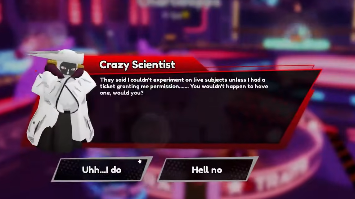 Step 2: Once you arrive, speak to the Mad Scientist NPC. He opens the trait menu, which functions as a gacha-style spin system.