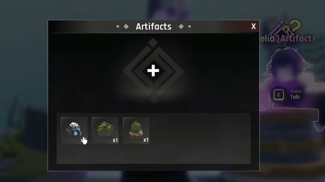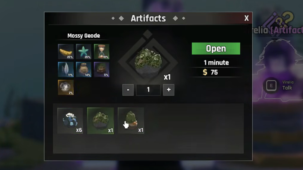 Step 2: Return to the safe dome and interact with the Virelia NPC by pressing E. Select the Open Artifacts dialogue option, choose how many geodes to crack, and confirm.