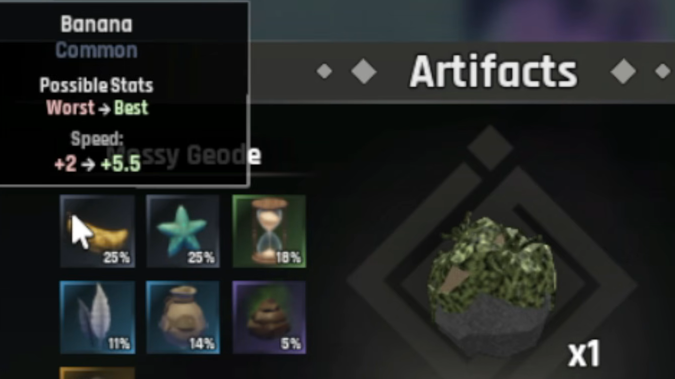 Every geode-sourced Artifact has a lowest and highest possible stat roll. The table below lists all 19 geode Artifacts organized by rarity, along with the geode type and fishing zone where you can farm them.