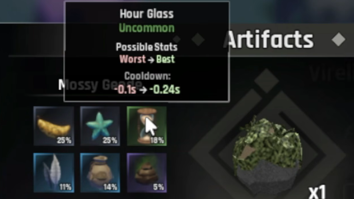 | Hour Glass | Uncommon | Mossy / Forgotten Deep | Cooldown: −0.1s → −0.22s |