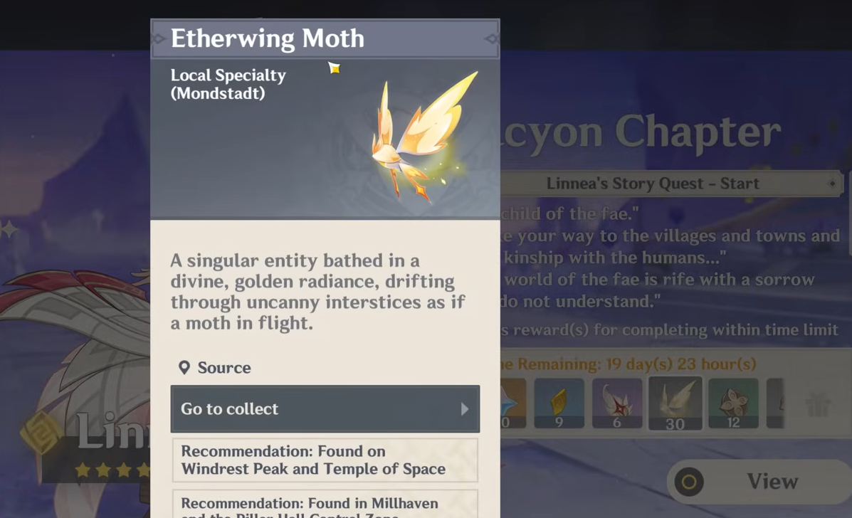 Etherwing Moth is a Mondstadt local specialty found in the Dornman Port and Temple of Space areas of northern Mondstadt, both introduced in Version 6.5. You need 168 of them, so enable the material tracking feature in your inventory and sweep through these zones every couple of days. They respawn on the standard 48-hour local specialty timer.