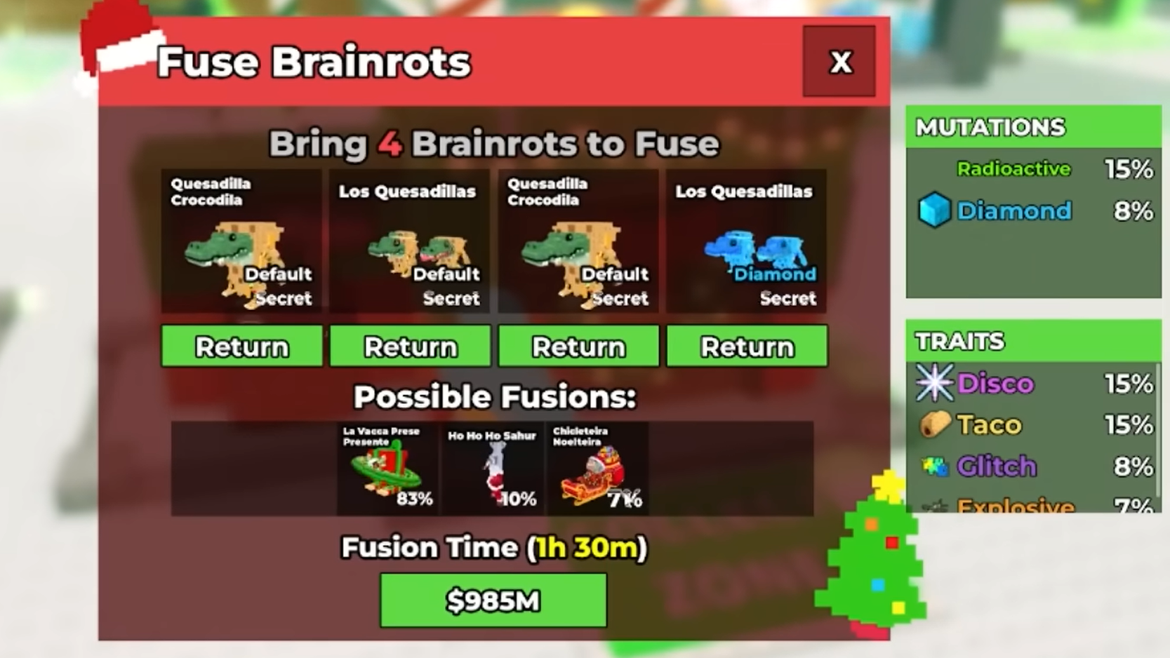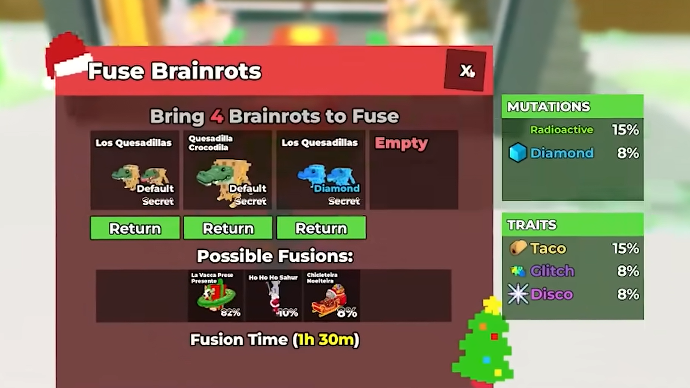 - Fused brainrots cannot be fused again. Once a result walks to your base, it is treated as final; the game prevents chaining it back into Santa’s Fuse.