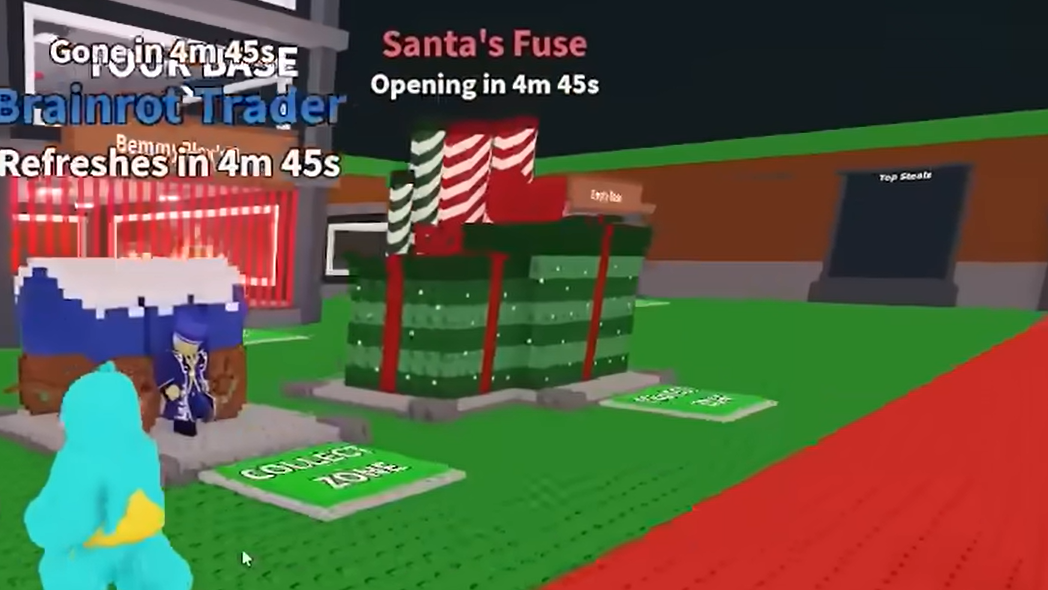 - Santa also stands in the central plaza. Every two hours, he steps forward and whacks a random brainrot placed in front of him, converting it into its Christmas variant.