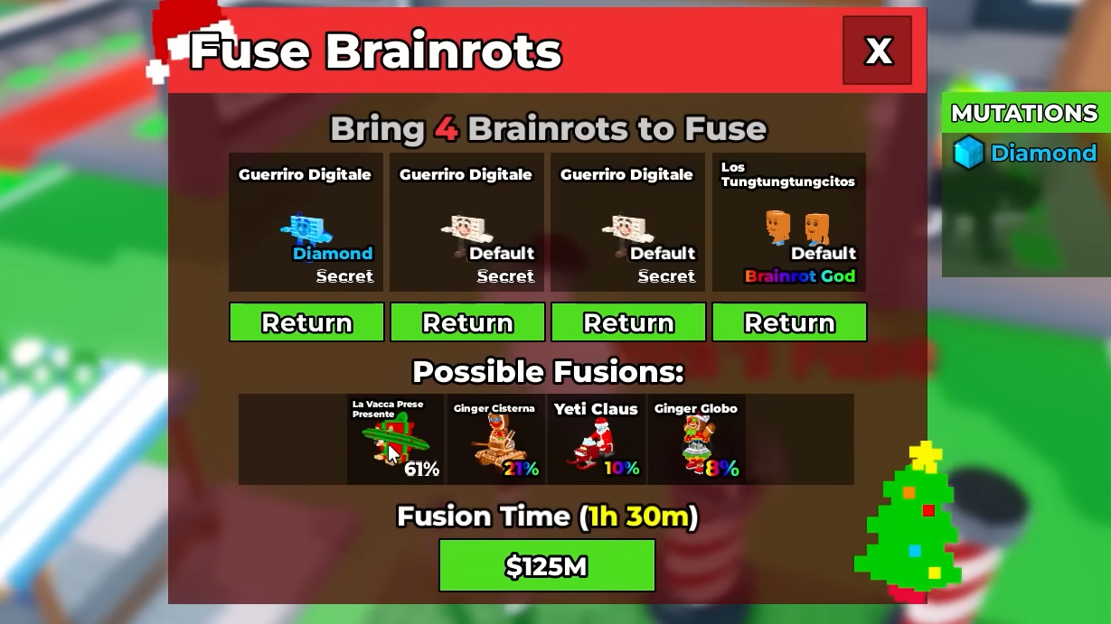 Unit quality matters. Feeding the machine stronger, more expensive brainrots increases the odds that the result is rarer and more valuable. The Christmas pulls generally outperform what you sacrificed in Dollars per Second, so repeatedly fusing is one of the cleaner ways to scale income during the event.