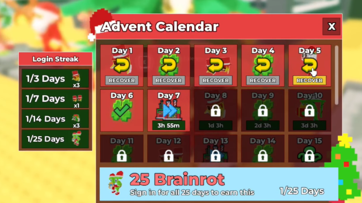 The Advent Calendar runs from December 1 to December 25 and quietly hides some of the better early‑game Christmas options. Unlocks are tied to specific days rather than performance: