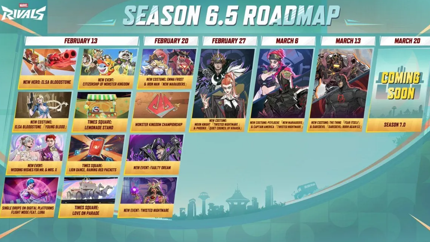 | Feb 13 | New hero: Elsa Bloodstone (Duelist). Events: Citizenship of Monster Kingdom, Wedding Wishes for Mr. & Mrs. X. Times Square: Love on Parade, Lemonade Stand, Lion Dance & Raining Red Packets. Costume: Elsa Bloodstone — Young Blood. Luna Snow's "Flight Mode" single on streaming platforms. New Team-Up: Psionic Mayhem. Balance patch. |