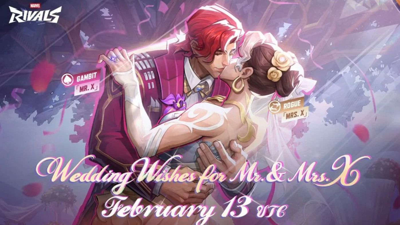 Wedding Wishes for Mr. & Mrs. X celebrates Gambit and Rogue's wedding with legendary Mr. X and Mrs. X costumes, wedding-themed sprays, emotes, a shared MVP animation, and nameplates. Popping the balloon that contains both wedding costumes automatically opens all remaining balloons for free.