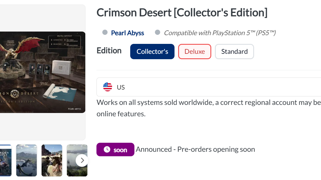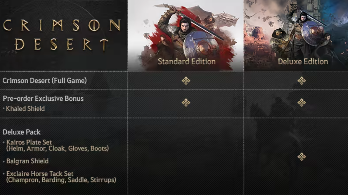 Pearl Abyss is selling Crimson Desert in three main tiers, though the Deluxe splits into physical and digital variants with different price points and contents. The physical versions include tangible collectibles that the digital versions skip entirely.