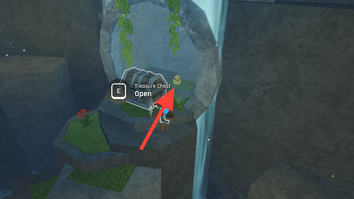 From the waterfall, turn 180 degrees. You'll see a climbable wall between the pond and the cave entrance with flowing water. Scale it all the way to the top to find another treasure chest and a Duck sitting beside it.