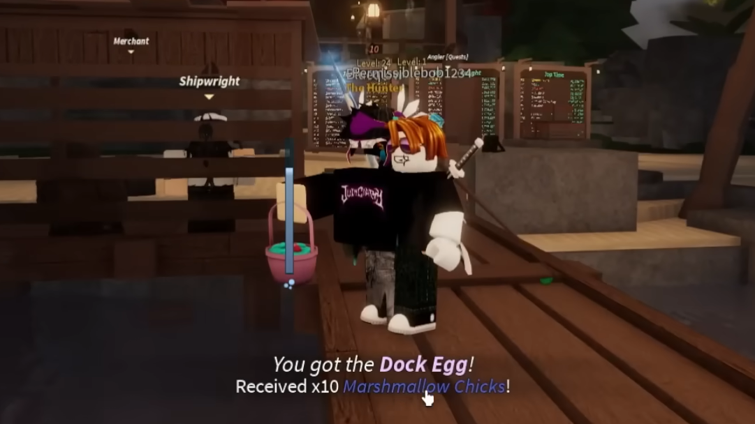 During the hunt, fish at Easter Cove using Marshmallow Chicks bait during clear weather and daytime in the Spring season. If you catch a Basketback Tortoise, return it to the Bloom Bunny to receive the Basketback Tortoise Boat. The hunt does not end early if someone catches one, so the full 20 minutes remain available.