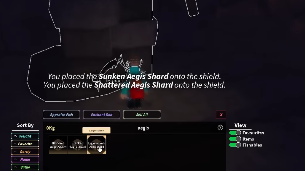 Quest 3 — Collect five Aegis Shards: This is the most involved quest. Two shards (Cracked Aegis Shard and Shattered Aegis Shard) sit on the ground. The Sunken Aegis Shard comes from regular fishing. The Bloodied Aegis Shard can only be fished up during a War Surge. The final piece, the Legionnaire's Aegis Shard, drops when you catch the Legionnaire Lamprey. The third Royal Guard only activates its quest during a War Surge — it glows red to signal availability.