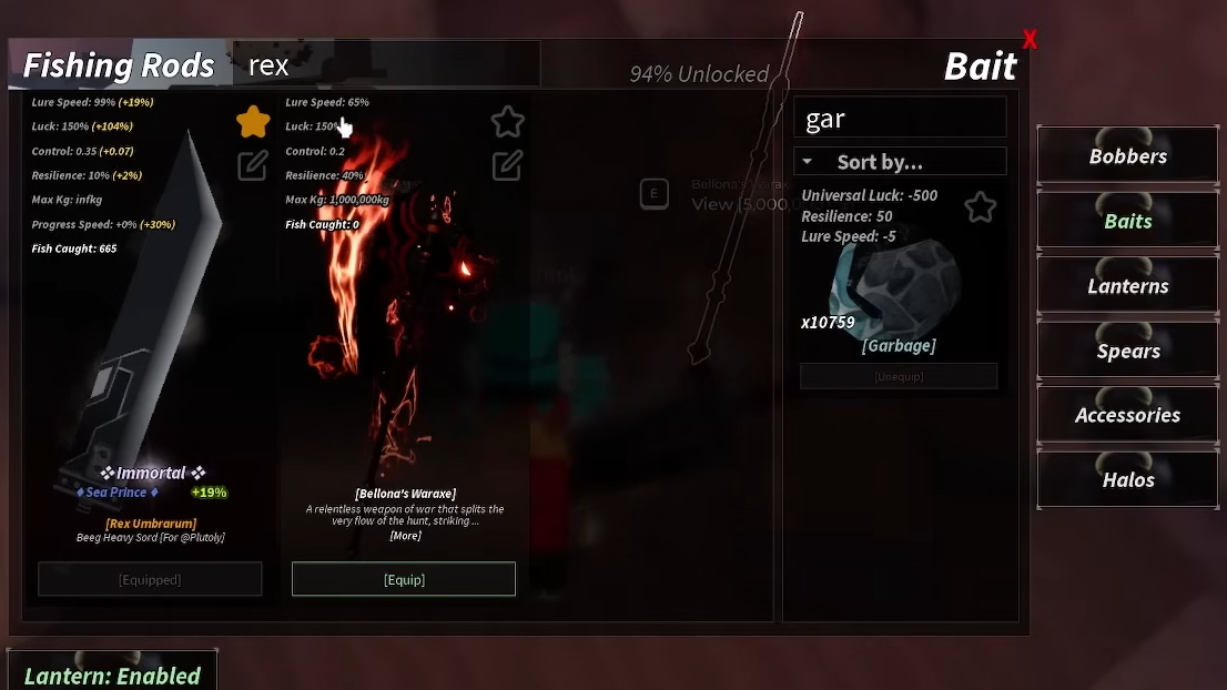 Once all three quests are done and every fish is logged, a second door opens in the cave near the sword rack. Bellona's Waraxe is inside, available for purchase. Its stats include 65% Lure Speed, 150% Luck, 2 Control, and 40% Resilience.