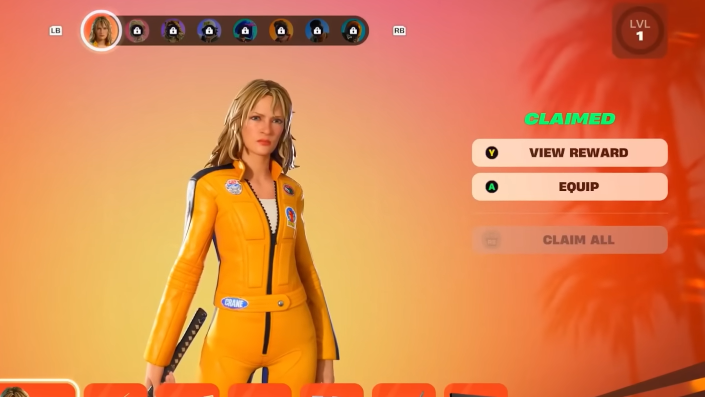 Her set is loaded with Kill Bill references: the Hanzo Katana appears both as a pickaxe and back bling, there’s a “Bride’s Colors” weapon wrap, vengeance-themed sprays and emojis, and a motorcycle glider called Kiddo’s Moto. Unlocking the second page finishes out her cinematic bundle before you move on to other sets.