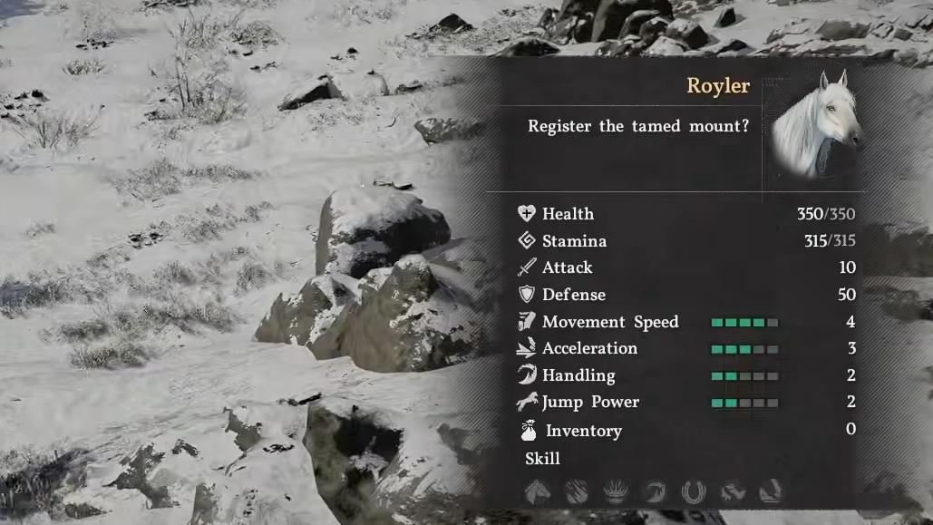 | Royler | Horse (white) | Snowgrass Hearth, Pailune (near frozen pond below the "P") | Tame via minigame | Speed and exploration |