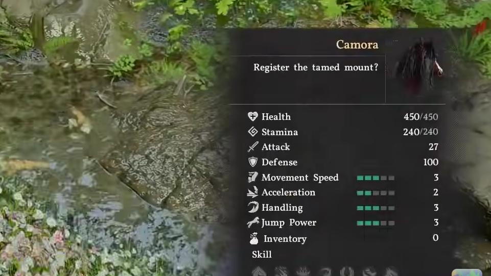 | Camora | Horse (red) | Redtree Forest, southeast of Tommaso near Red River | Tame via minigame | Mounted combat (highest attack/defense) |