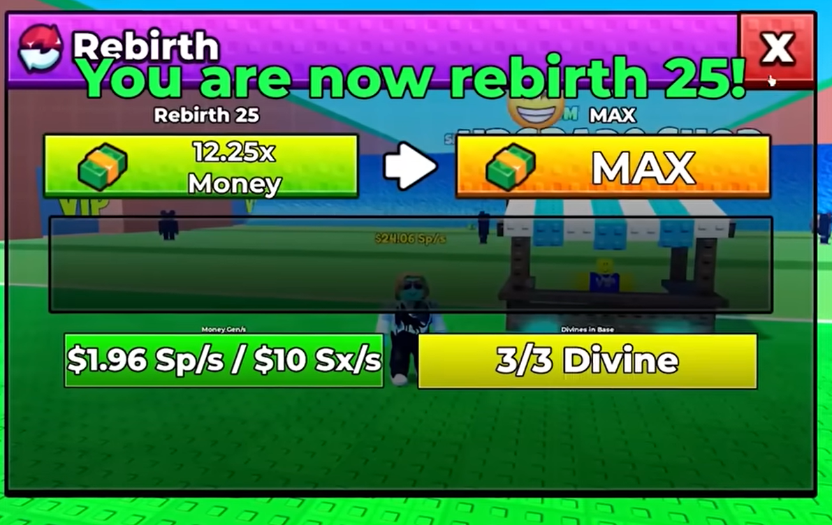 The first 20 Rebirth levels each add a 0.5x multiplier to your base income. After level 20, each Rebirth only adds 0.25x. The requirements also escalate sharply in the final tiers. Early Rebirths only require a specific speed level (starting at 40 speed for Rebirth 1), but the later ones demand a combination of high speed, substantial base money generation rates, and Divine Brainrots placed in your base.