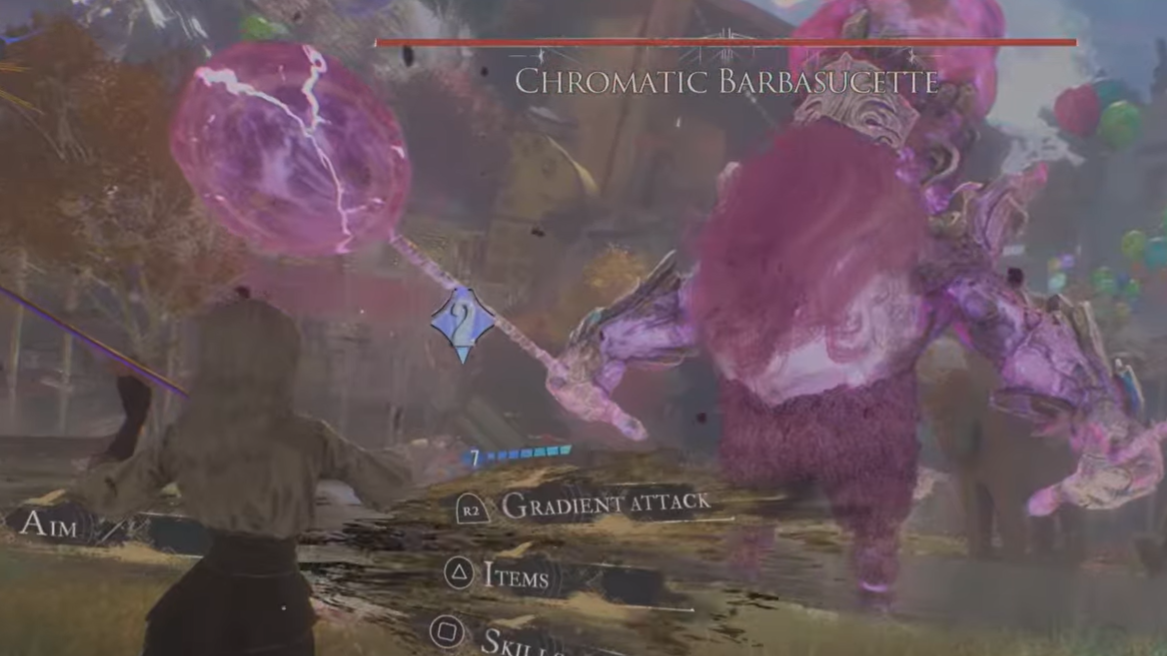 - “Drop kick” sequence: a single belt shot at the party that inflicts Barbapapa if unblocked, then a rapid teleport above you into a kick, a follow‑up hand slam, two fly‑by attacks, another belt shot, and finally a Gradient drop kick. The Gradient parry window is several seconds after the sequence starts, once Osquio begins descending from its final jump.