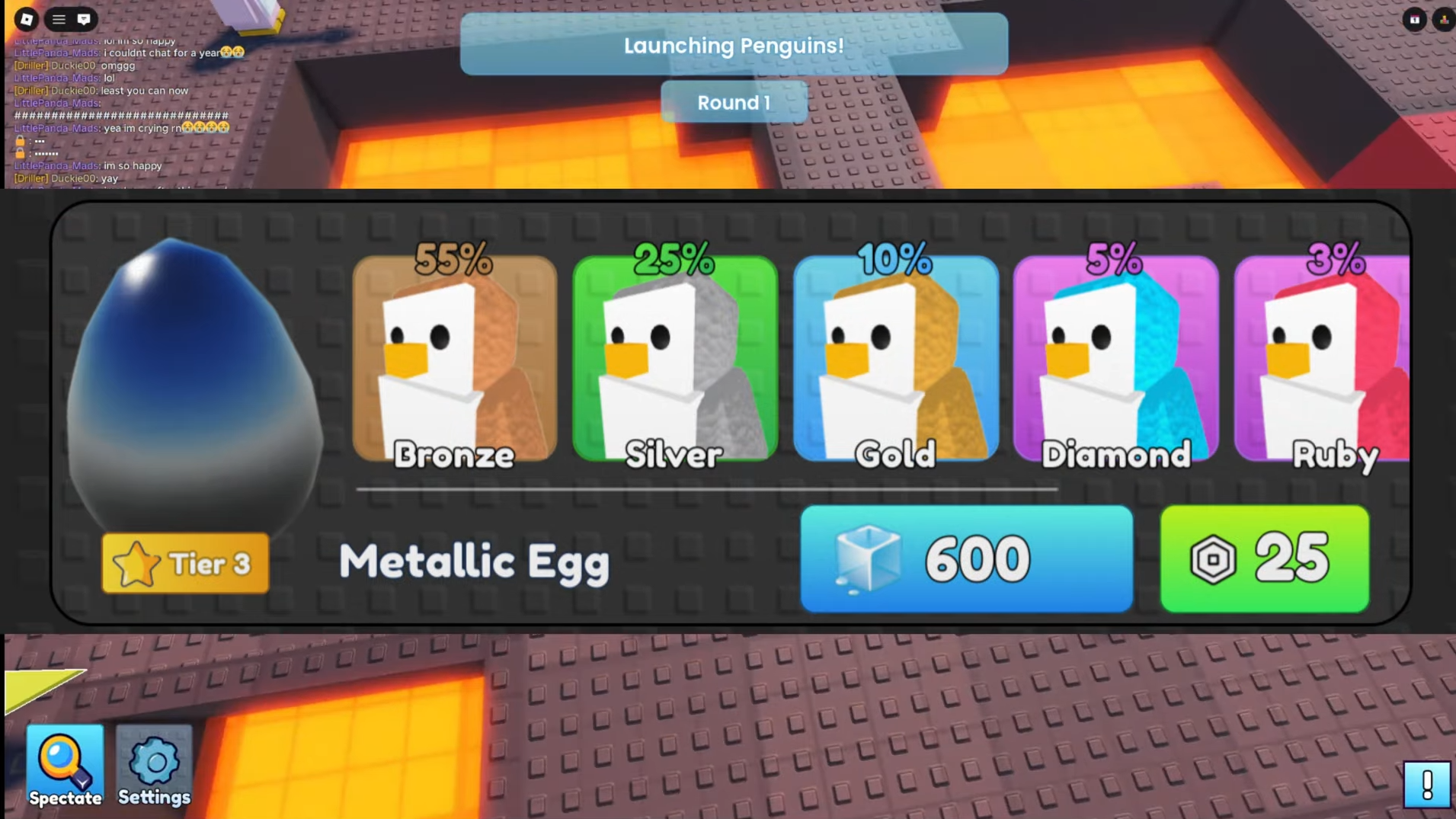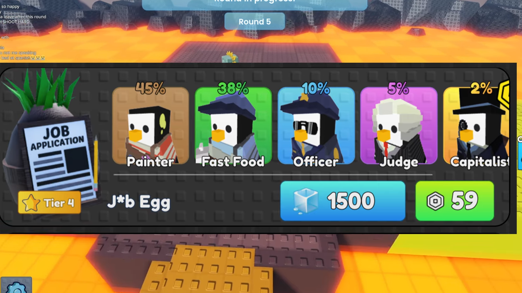 Skins can't be bought directly. Instead, the Skin Shop on the lobby platform sells eggs organized into tiers. Each egg contains a set pool of skins at the listed drop rates. Higher-tier eggs cost more Ice but hold rarer skins. Skin rarities follow five tiers: Common, Uncommon, Rare, Epic, and Legendary. A separate shop — accessible via the red basket icon on the left side of the screen — sells limited eggs and bundles for Robux.
