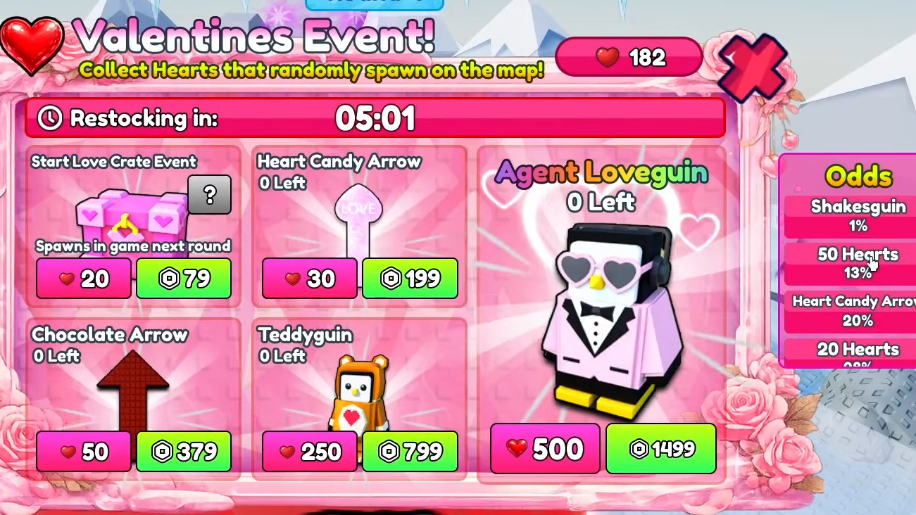 A limited-time egg tied to the Valentine's event, purchasable only with Robux. Four skins live inside, topped by the Legendary Heart Breaker at 1%. Two additional Valentine's skins exist outside this egg: Shakesguin, earned from the Start Love Crate event, and Agent Loveguin, which costs 500 Hearts or 1,499 Robux. Teddyguin can be obtained for 250 Hearts during the same event.